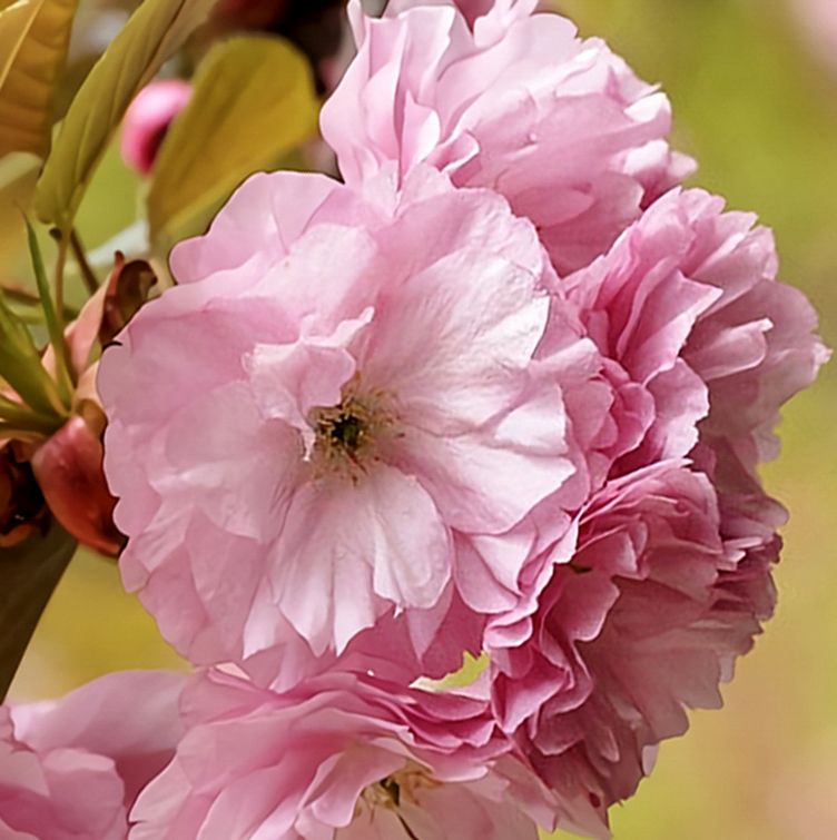 This cultivar of flowering cherry has lovely large profuse flowers, which are double, rather than the single varieties. Their high quality flowers also make this cultivar a popular ornamental tree for garden landscapes. The bark becomes shiny and add focal points during the dormant seasons. Summer leaves are often green and bronze. Imagine a delicate cluster of dark pink blossoms.